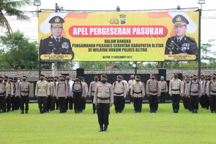 Polres Blitar melaksanakan Apel Pergeseran Pasukan (Serpas) dalam rangka pengamanan Tempat Pemungutan Suara (TPS) Pemilihan Kepala Desa (Pilkades) serentak tahun 2022 di halaman Mapolres Blitar Polda Jawa Timur, Rabu (21/12/2022) pagi.