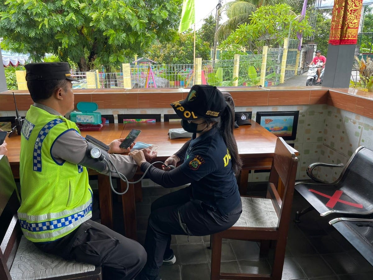 Polres Karangasem. Dalam menjaga kesehatan personel yang tersprint dalam tugas Operasi Lilin Agung 2022, personel Subsatgas Dokkes Pengatur A.A. Made Yulia Permatasari, A.Md.Kep. melakukan pengecekan tensi personel saat selesai apel dilapangan Apel Pesat Gatra Polres Karangasem, Sabtu 24/12/22.