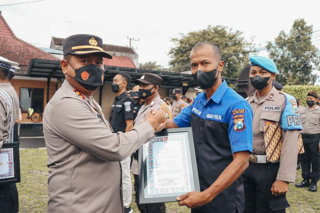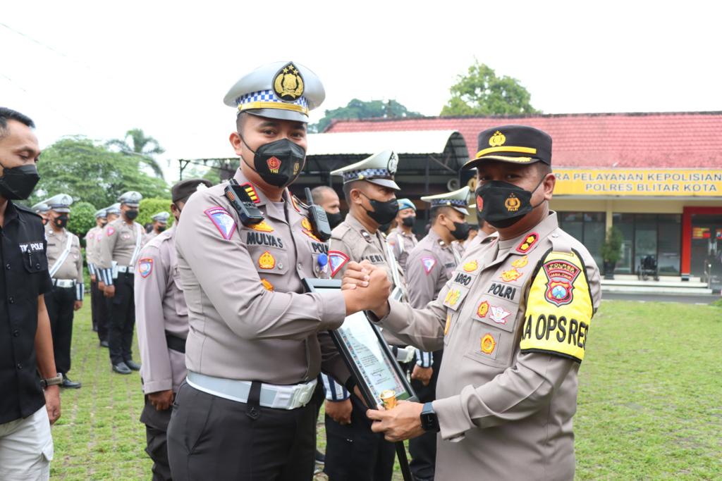Kapolres Blitar Kota AKBP Argowiyono S.H S.I.K M.Si memberikan penghargaan kepada 20 anggotanya yang berprestasi dan berdedikasi terhadap tugas dan tanggungjawabnya.
