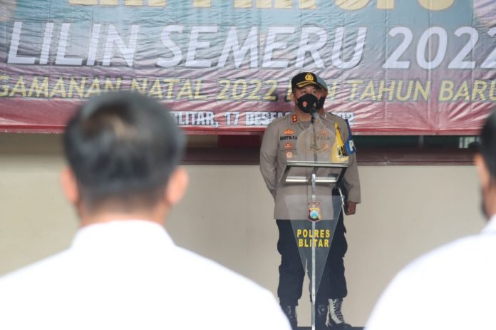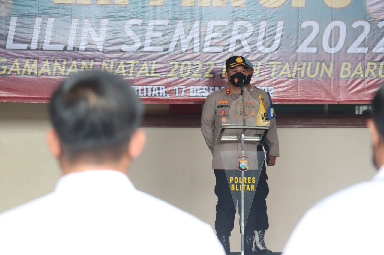 Antisipasi pengamanan jelang perayaan Natal 2022 dan Tahun Baru 2023, Kapolres Blitar AKBP Adhitya Panji Anom, S.I.K memimpin apel jam pimpinan di Gedung Hoegeng Mapolres Blitar, Senin(26/12/2022).