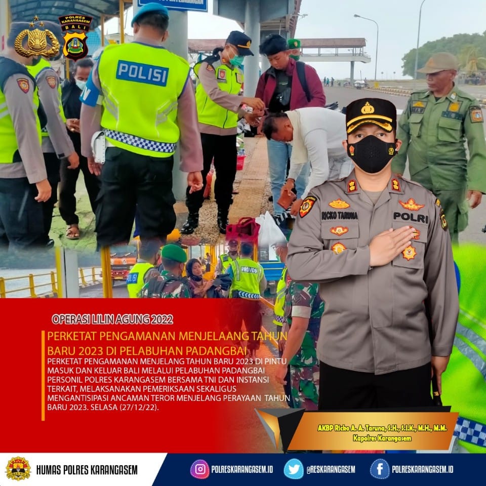Polda Bali – Polres Karangasem, Jaga Kamtibmas wilayah Bali aman dan cegah peredaran barang terlarang dan barang berbahaya masuk Bali yang dapat menggangu stabilitas keamanan Bali menjelang Tahun Baru 2023, pengawasan dan pemeriksaan Pos pintu keluar dan masuk Bali melalui Pelabuhan Padangbai diperketat sesuai SOP oleh Polres Karangasem melalui Polsek Padangbai dalam Ops Lilin Agung Tahun 2022.