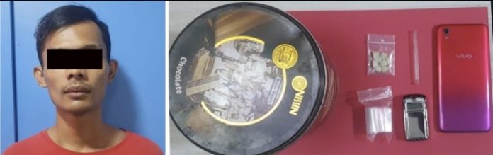 Masih AKP Hendro “Dari tangan pelaku diamankan 1 buah kaleng biskuit Nissin Wafers yang di dalamnya terdapat 1 buah klip plastik kecil yang didalamnya berisi 8 butir narkotika golongan I jenis Pil Extacy warna Coklat berbentuk segitiga, dengan berat ±3,39 (tiga koma tiga puluh sembilan) gram beserta klip plastiknya, 1 buah pipet kaca yang di dalamnya terdapat narkotika jenis Sabu dengan berat bruto ±2,12 (dua koma dua belas) gram beserta pipet kacanya, 1 buah timbangan elektrik Hitam Silver, 1 bendel klip plastik kecil, 1 buah unit HP merk VIVO tipe 9C warna Merah dengan simcard Simpati,” ucapnya.