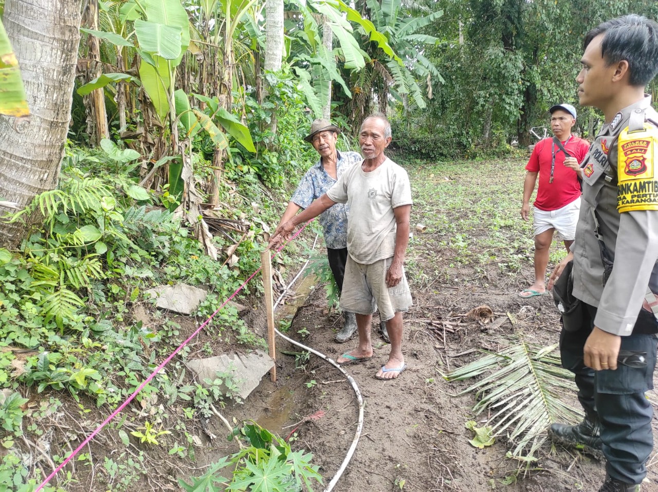 Kemudian kedua belah pihak mendengarkan saran Bhabinkamtibmas lalu sepakat dengan batas tanah masing-masing dan memberi batas berupa tali dan patok agar ke depan tidak terjadi permasalah tanah.