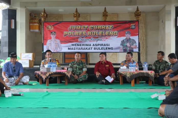 Kapolres Buleleng menyampaikan, “jumat curhat” dilaksanakan sifatnya untuk menggali informasi dalam rangka pemeliharaan ketertiban masyarakat, selain itu sebagai bentuk saluran komunikasi sehingga tidak ada hambatan dan keterlambatan dalam penyampaian inforamsi untuk menghindari permasalahan, ucap Kapolres.