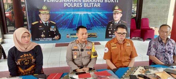 Kapolres Blitar didampingi anggota komisi 3 DPR RI dan Kasat Reskrim saat menjelaskan barang bukti dalam satu tahun yang diungkap Polres Blitar,(Sumber foto doc Hms Res Blitar)