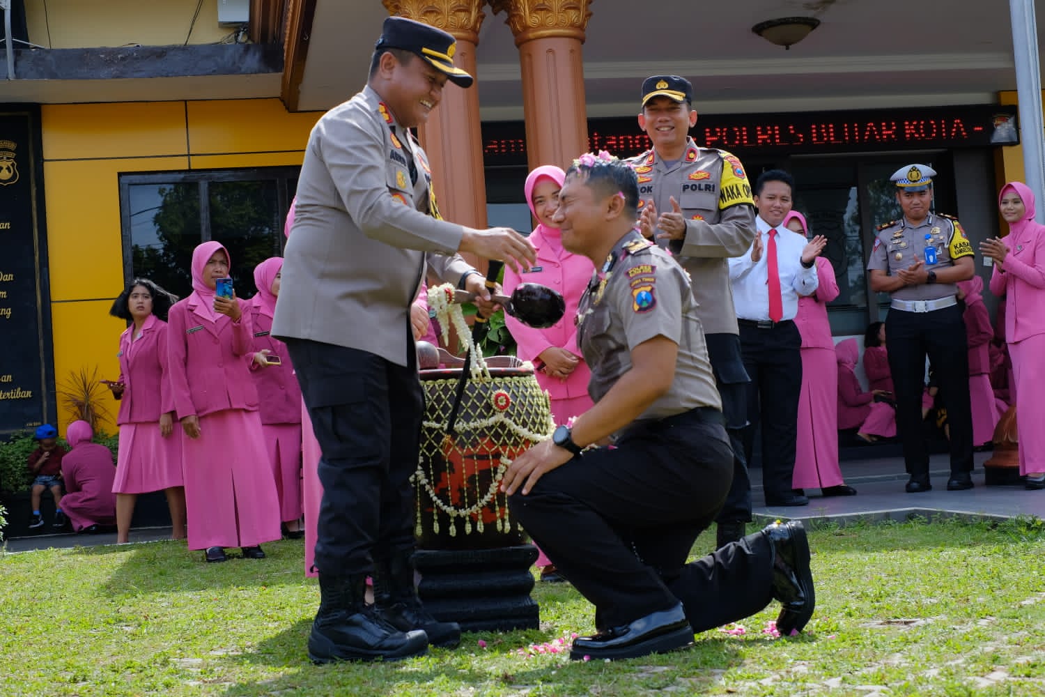 Setelah mengikuti upacara, para anggota yang mendapat kenaikan pangkat disiram menggunakan air bunga oleh Kapolres.