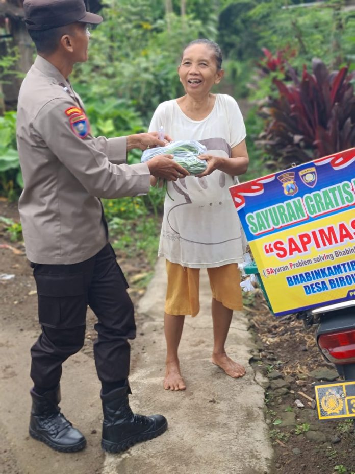 Program Polres Blitar peduli warga masyarakat SAPIMAS terus berlanjut. Aipda Arifin Mustofa melaksanakan kegiatan pembagian sayur gratis kepada warga yang Desa Birowo kec Binangun Kabupaten Blitar,Sabtu (07/01/23).