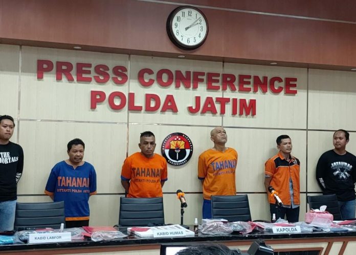 Sementara itu Dirreskrimum Polda Jatim, Kombes Pol Totok Suhariyanto, pengungkapan ini berjalan kurang lebih 24 hari, karena lima pelaku yang telah kita identifikasi itu cukup lihai melarikan diri. Pertama, itu dilakukan penangkapan terhadap NT hari Jumat di salah satu penginapan di Bandung.