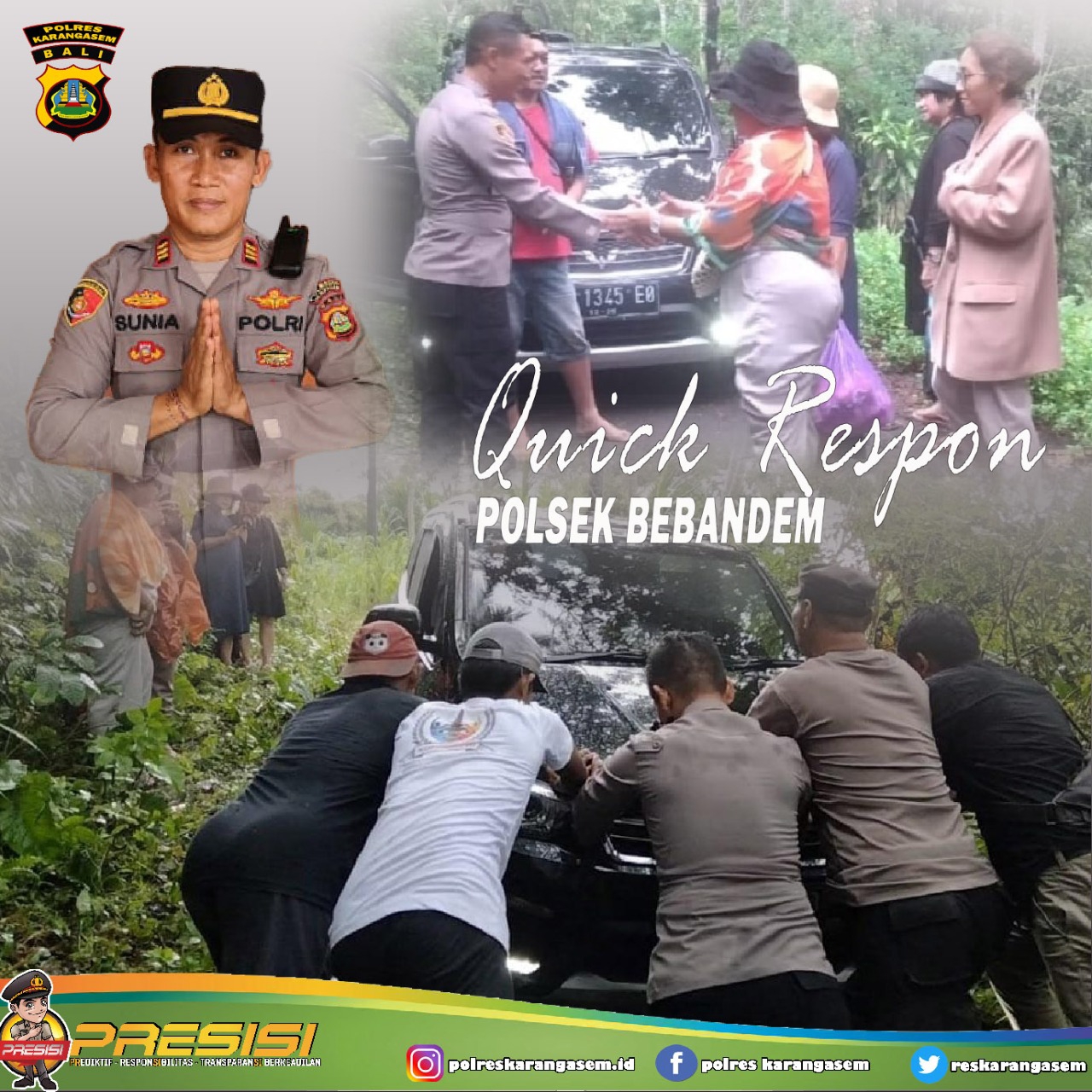 Polsek Bebandem dipimpin langsung Kapolsek AKP I NENGAH SUNIA, S.H tiba di lokasi, dan langsung membantu bersama warga sekitar untuk mendorong kendaraan namun tidak berhasil, sehingga Anggota Polsek menghubungi mobil derek untuk mengevakuasi kendaraan dan kendaraan berhasil dievakuasi sekira Pkl 18.00 wita. Selanjutnya yang bersangkutan melanjutkan perjalanan menuju Denpasar.
