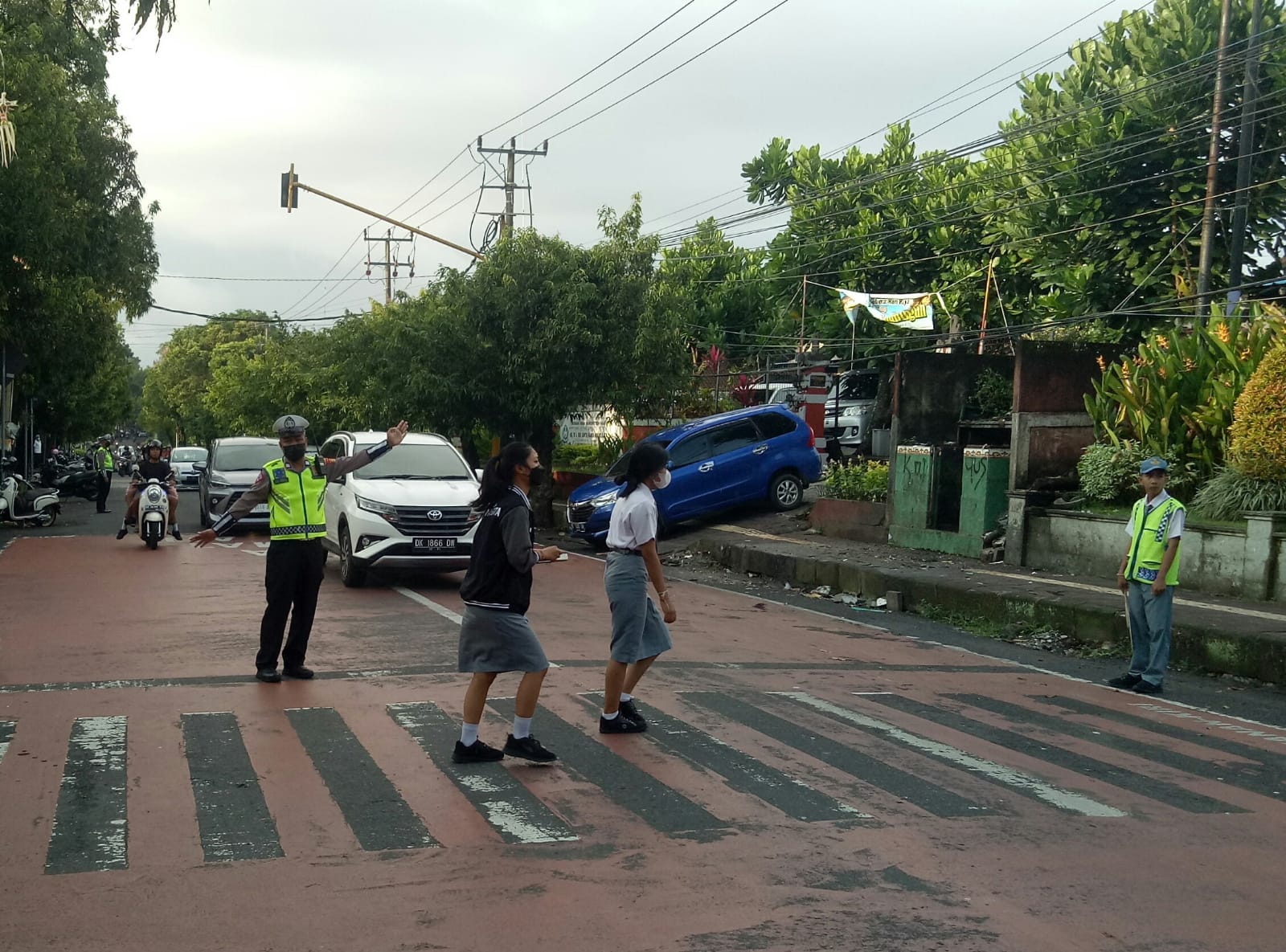 Berdasarkan hasil pemantauan di lapangan tampak personil lalu lintas Polres Tabanan melakukan pengaturan arus lalu lintas dan melayani masyarakat yang menyeberang jalan dan menyebarkan siswa di depan sekolah. (Humas Polres Tabanan)