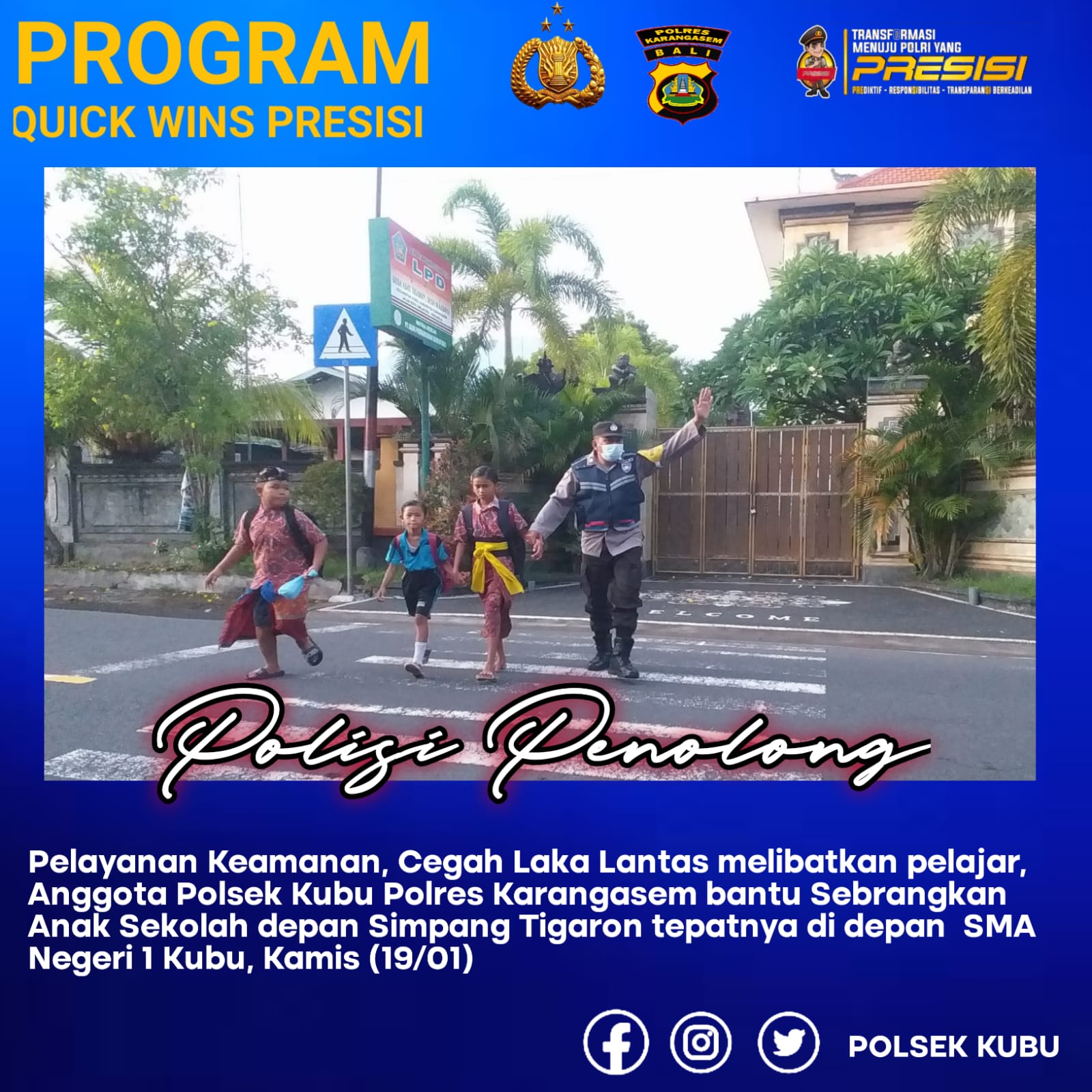 Seperti halnya yang dilakukan Bhabinkamtibmas Desa Sukada Polsek Kubu bagian dari Polres Karangasem Aiptu I Gede Putu melaksanakan giat pengamanan, pengaturan dan atensi Anak anak sekolah menyebrang jalan di dijalan Umum amlapura singaraja, tepatnya disimpang tiga tigaron Depan SMA Negeri 1 Kubu, Kamis ( 19/01)