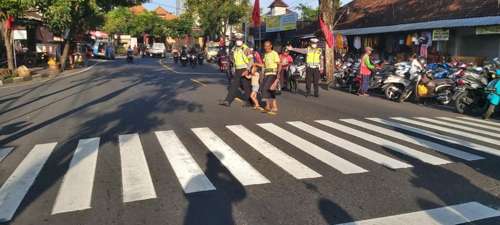 Kanit Turjawali Satlantas Polres Badung Iptu I Nyoman Mustika saat di konfirmasi via ponselnya menjelaskan dirinya kebetulan sedang mengatur arus lalu lintas di depan Pasar Adat Sempidi, melihat ada seorang kakek bersama cucunya langsung dia mendekatinya dan menyeberangkan jalan. “Agar tidak membahayakan pejalan kaki /penyeberang jalan tersebut saya bantu seberangkan,” Ujarnya.