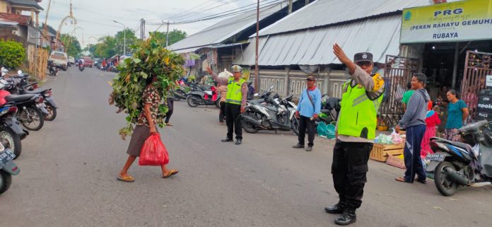 Polsek Kubu – Untuk menjaga Keamanan dan kelancaran arus lalulintas, di Pasar Tumpah Jajaran Polsek Kubu Polres Karangasem melaksanakan pengamanan dan pengaturan arus lalulintas dan bantu warga masyarakat yang hendak menyebrang jalan
