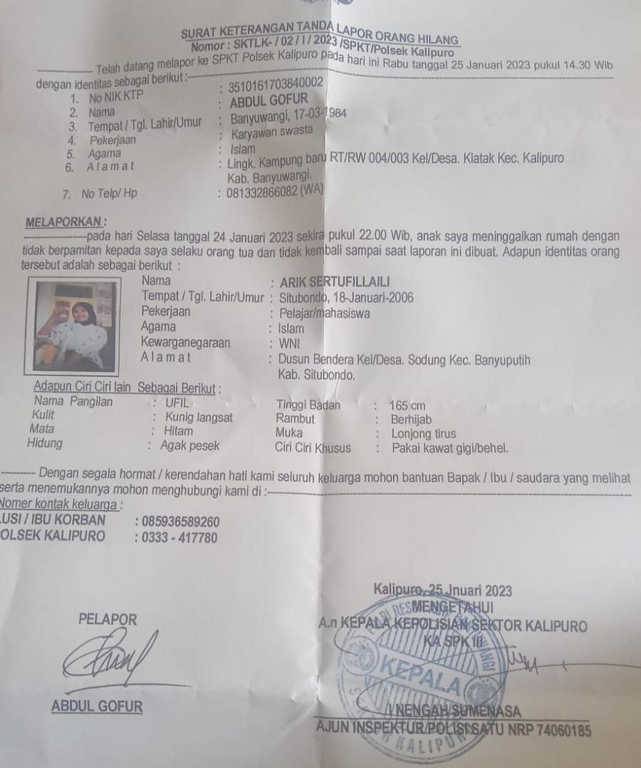 Kepada petugas jaga Polsek Kalipuro, Ghofur mengaku bahwa pada hari Selasa (24/1/2023) sekira pukul 22.00 Wib, anaknya yang bernama ARIK SERTUFILLAILI (17) status pelajar, alamat KTP Dusun Bendera, Kelurahan Sodung, Kec. Banyuputih, Kab. Situbondo, telah meninggalkan rumah tanpa pamit dan tidak kembali sampai laporan ini di buat. (25/1/2023).