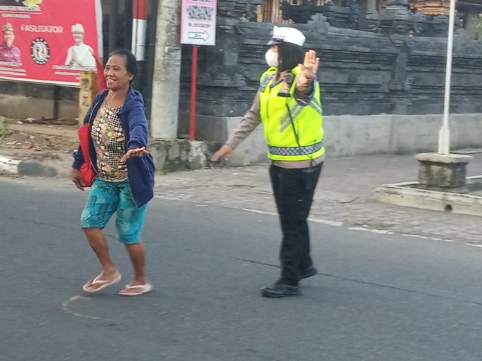 Seperti halnya yang dilakukan oleh anggota Polwan Satuan Lalu Lintas Polres Badung Bripka Dewi Tastraeni, nampak sibuk melakukan pengaturan lalu lintas yang lumayan padat, disaat bersamaan ada seorang ibu-ibu hendak menyeberang jalan, dengan cekatan Bripka Dewi menggandeng tangan ibu-ibu tersebut dan menyeberangkannya.