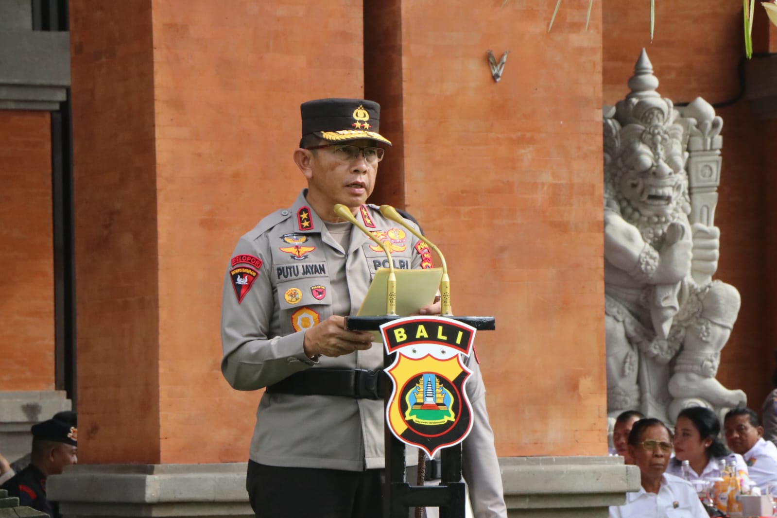Kapolda Bali Irjen. Pol. Drs. Putu Jayan Danu Putra, S.H., M.Si., memimpin upacara perayaan Hut Satpam ke-42 di halaman depan Mapolda Bali, Senin (30/1/2023)