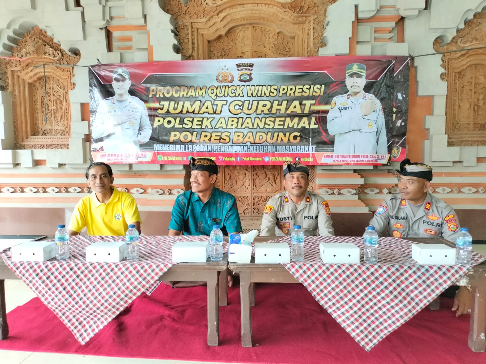 Kapolsek Abiansemal Kompol I Gusti Made Sudarma Putra, S.Sos., S.H., M.A.P., seijin Kapolres Badung, menjelaskan kegiatan Jumat Curhat ini bertujuan untuk mendengarkan langsung keluhan masyarakat, terkait situasi Kamtibmas agar tetap terjaga dengan aman, damai dan kondusif.