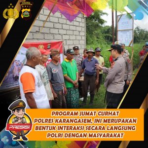“Program ‘Jumat Curhat’ ini merupakan bentuk interaksi secara langsung Polri dengan masyarakat untuk mendengarkan saran, kritikan, masukan serta aduan masyarakat terkait dengan pelayanan yang selama ini telah Polres Karangasem lakukan,” terang AKBP Ricko A. A. Taruna.