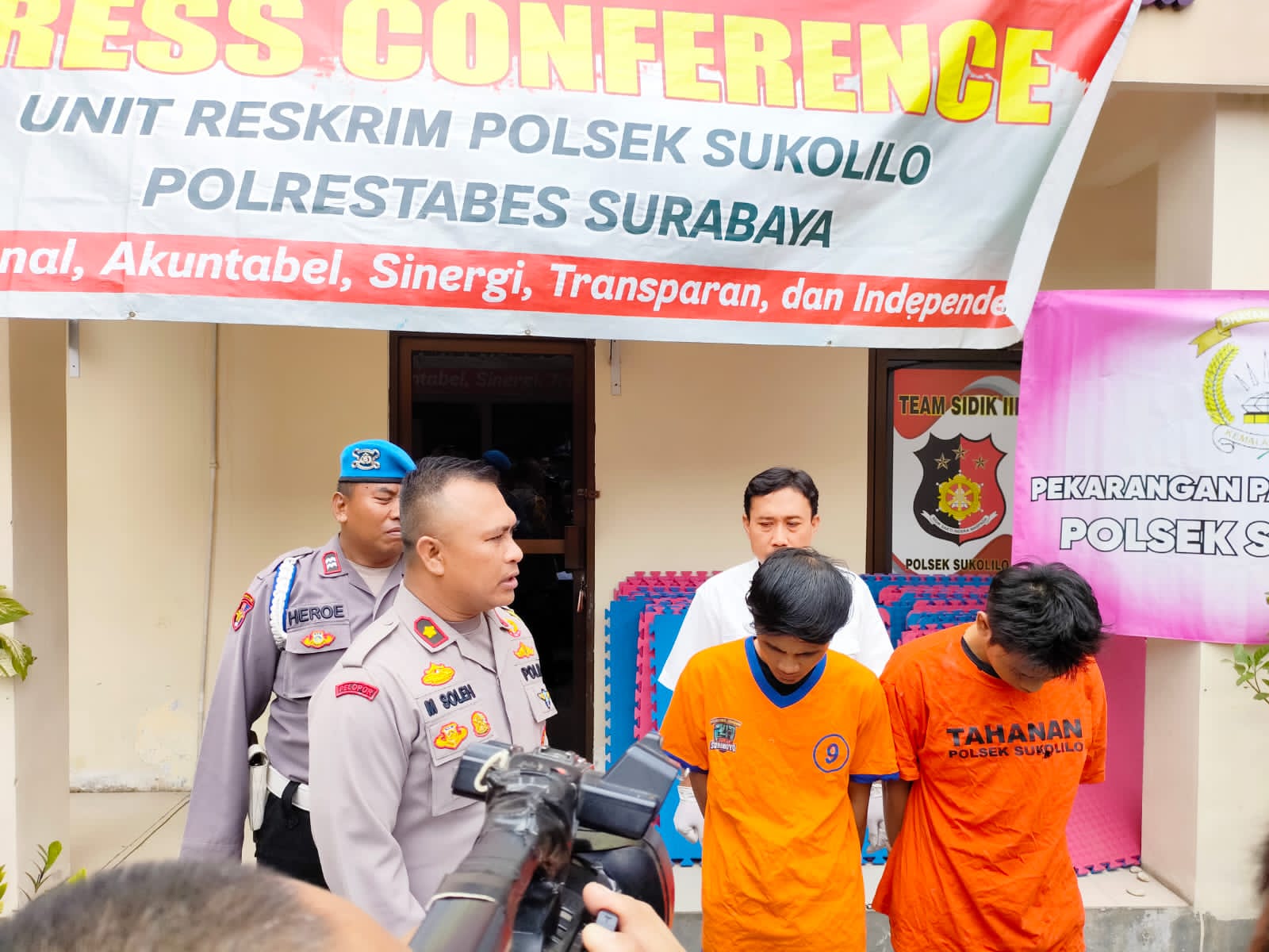 2 pelaku dipamerkan di halaman mako polsek Sukolilo Surabaya, dihadapan Rekan media, Senin 13 Februari 2023,jam 13.00 wib.