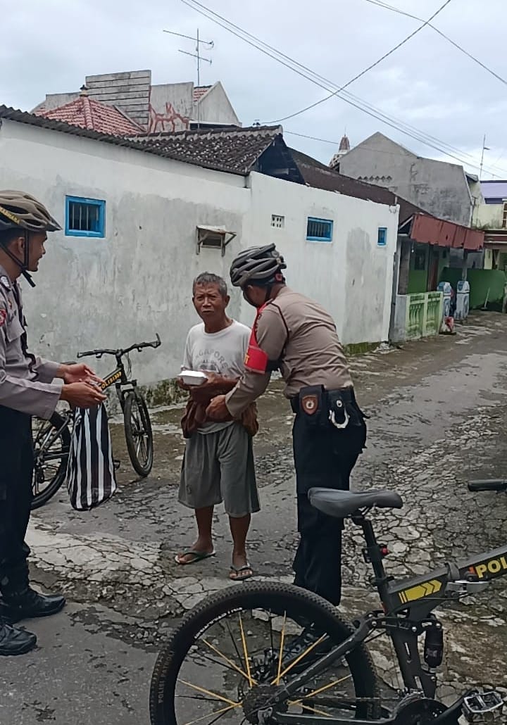Satsamapta Polres Blitar melaksanakan giat patroli sepeda sambil membagikan nasi bungkus kepada sejumlah warga yang membutuhkan, sebagai salah satu bentuk pendekatan kepada masyarakat, Jumat (24/02/2023).