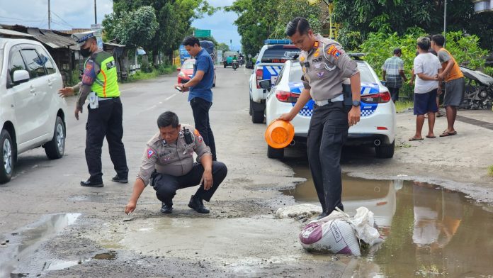 Satlantas Polres Blitar Kota dibantu warga menambal jalan berlubang yang di Jalan Raya Kediri Blitar tepatnya di Togogan Srengat Kabupaten Blitar, pada Rabu (1/3) Siang.