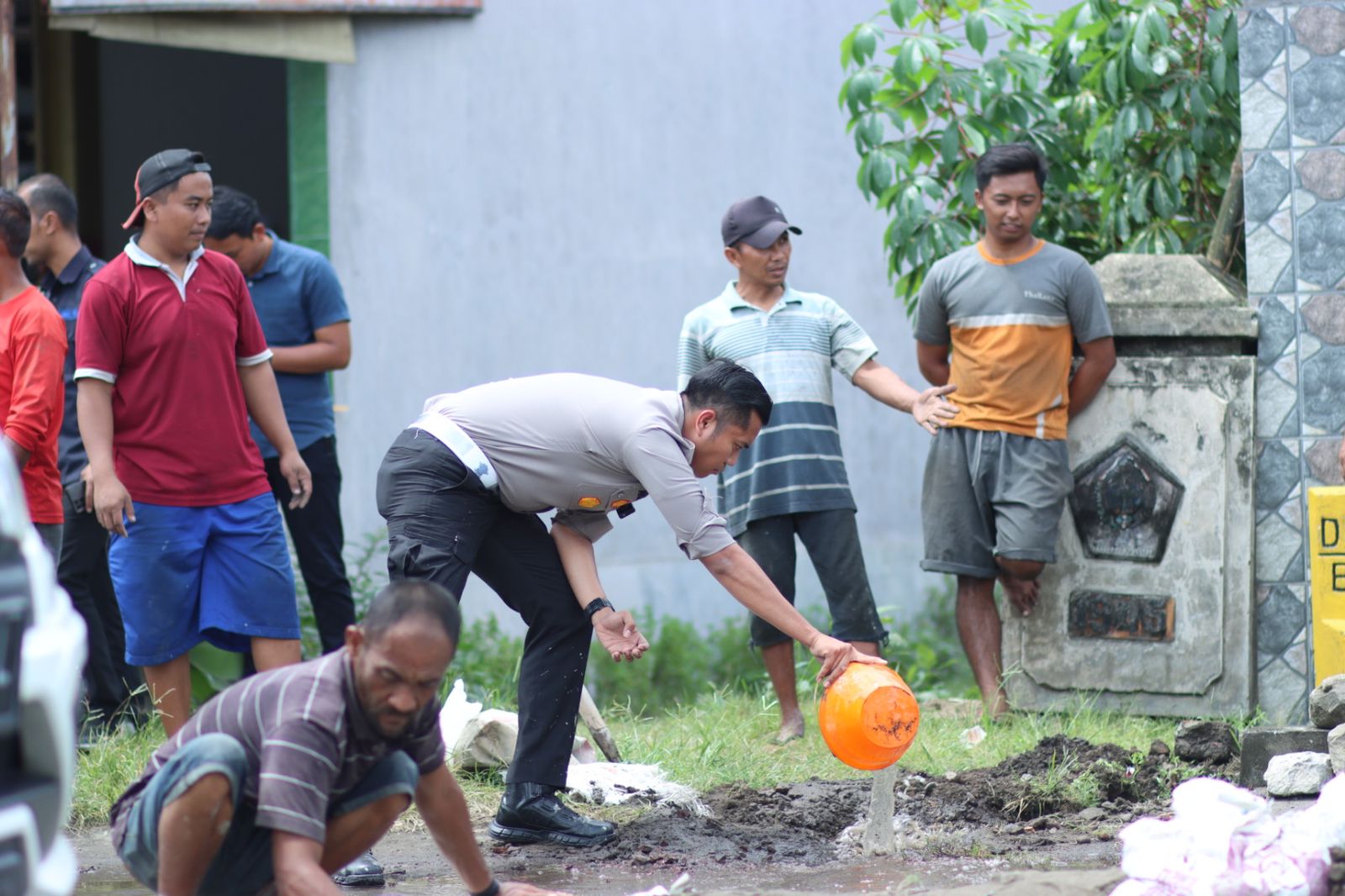 Kasatlantas Polres Blitar Kota AKP Mulya Sugiharto langsung mengajak anggotanya menambal lubang jalan menggunakan semen dan pasir.