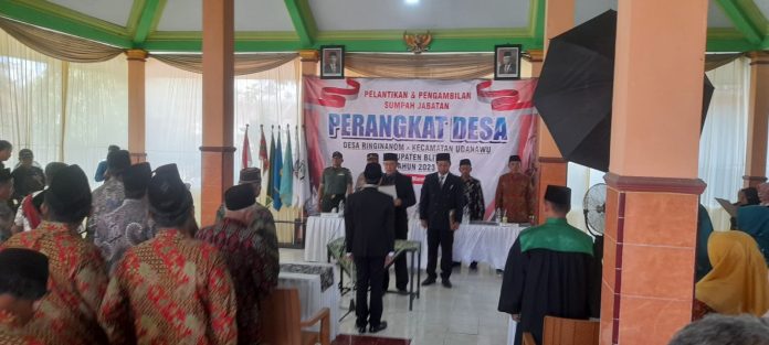 Bertempat di balai Desa Ringinanom undangan dari pemdes mulai pukul 09.00 WIB dilaksanakan agenda pelantikan dan pengambilan sumpah jabatan perangkat Desa baru yang sudah terpilih dari sekian banyak peserta hanya 1 orang yang diangkat. Sesuai dengan peraturan yang ada bahwa hanya yang terpilih yang akan bekerja sebagai perangkat Desa nantinya. Pada kegiatan ini undangan yang hadir ialah Camat, Danramil, Kapolsek, KUA kec. Udanawu, BPD, LPMD Desa Ringinanom dan tokoh masyarakat lainnya.
