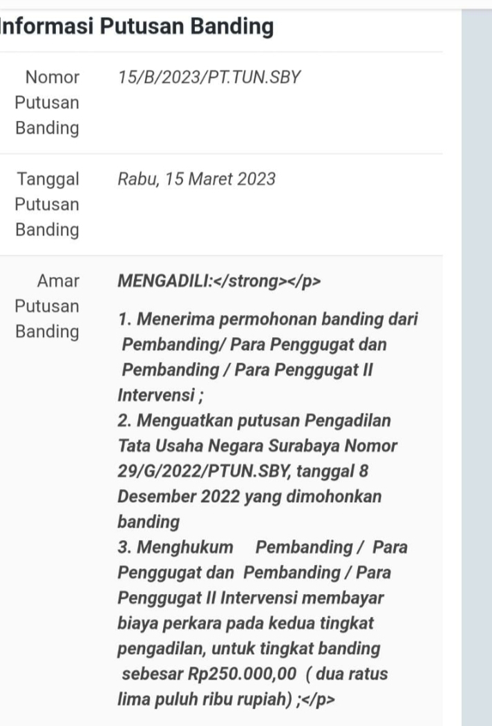 Seperti yang tertuang pada Putusan Majelis Hakim Pengadilan Tinggi Tata Usaha Negara Nomor : 15/B/2023/PT.TUN.SBY yang Amarnya Menyatakan Menguatkan Putusan Pengadilan Tata Usaha Negara Surabaya.