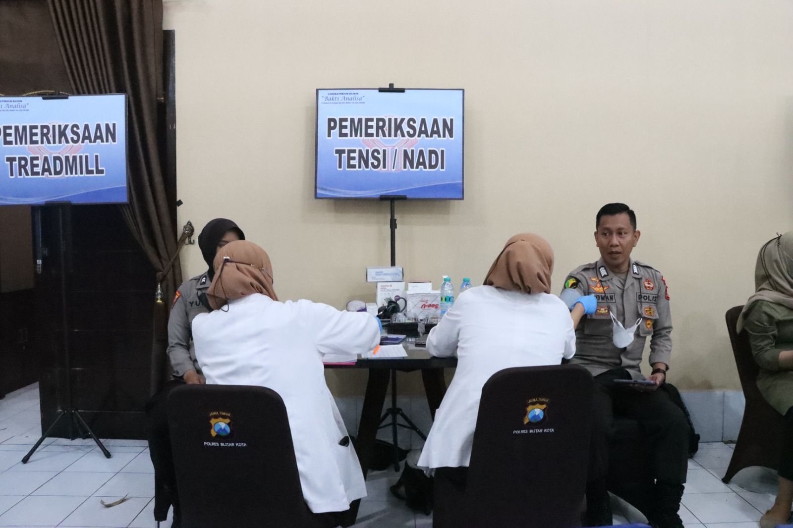 Kegiatan pemeriksaan kesehatan berkala berjalan lancar, terlihat Wakapolres Blitar Kota, PJU Polres Blitar Kota ,anggota Polres dan polsek serta ASN antusias mengikuti tahapan demi tahapan dari berbagai aspek pemeriksaan.