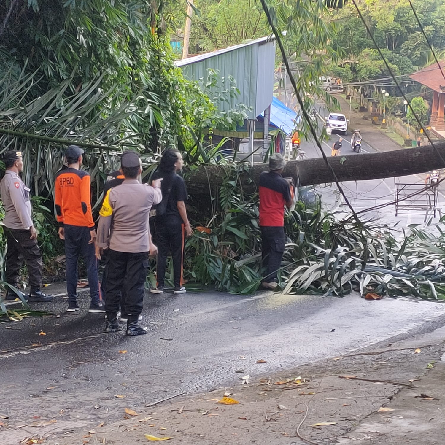 “kami juga tetap menghimbau kepada masyarakat agar yang memiliki pohon yang tinggi dan rentan tumbang untuk segera di tebang untuk antisipasi hal-hal yang tidak diinginkan”, imbuh Kapolsek Abiansemal.