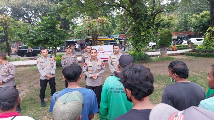 Waka Polda Bali Brigjen Pol Drs. Ketut Suardana M.Si., serahkan bantuan sembako kepada para petugas DLHK Kota Denpasar, di lapangan Lumintang pada selasa (28/3/2023).