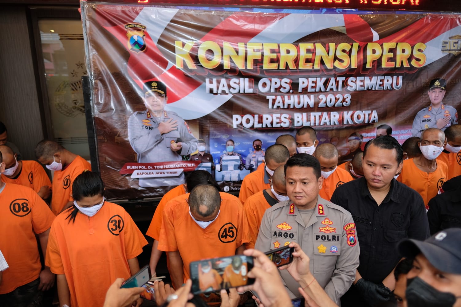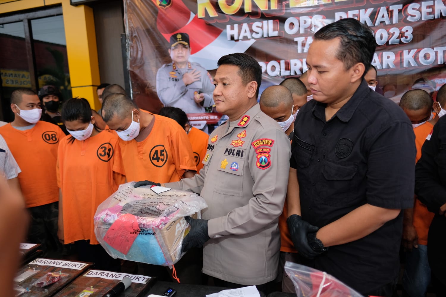 Polres Blitar Kota melaksanakan konferensi pers terkait kasus pembuangan bayi yang dilakukan tersangka Riyanto (45) yang juga suami Kepala Desa Jaten, Kecamatan Wonodadi bersama pasangan selingkuhnya, Widayanti (30). Kedua tersangka tersebut terancam hukuman 15 tahun penjara.