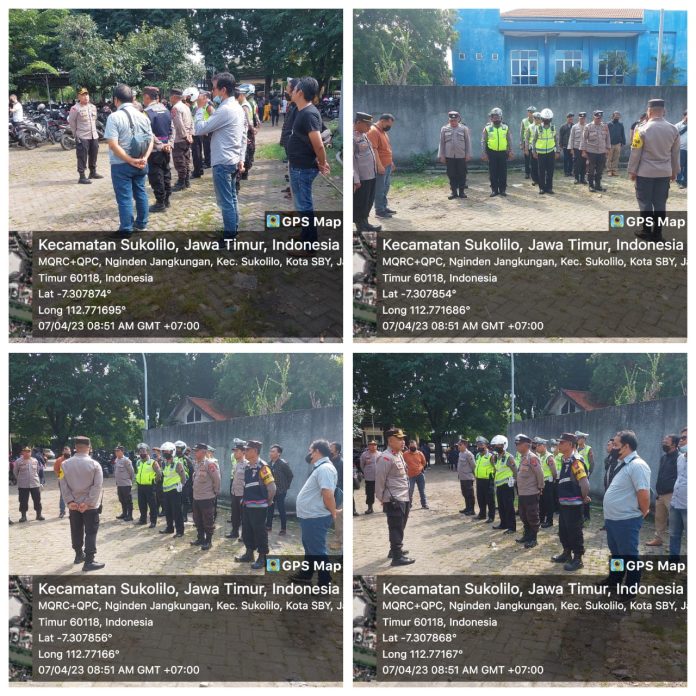 Apel Persiapan Pengamanan Paskah Th.2023 di Gereja Bethany Nginden Surabaya dipimpin oleh Kapolsek Sukolilo Surabaya Kompol M.Sholeh,SH.MM didampingi Kanit Intelkam, Kanit Lantas dan Kanit Samapta Polsek Sukolilo Surabaya,07 April 2023 pukul 08.30 wib.