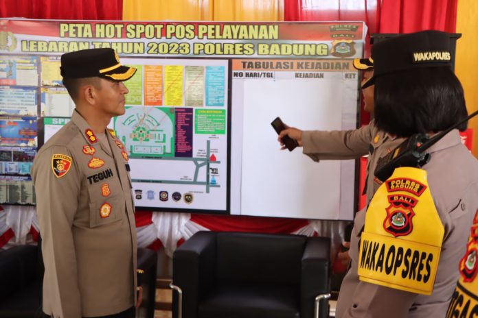 Informasi-Realita.net,Bali – Selesai mengikuti apel gelar pasukan Ops Ketupat Agung 2023 yang dipimpin Kapolda Bali Irjen. Pol. Drs. Putu Jayan Danu Putra, S.H., M.Si Kepala Kepolisian Resor Badung AKBP Teguh Priyo Wasono, SIK, langsung turun cek Pos Pengamanan Mangupura di Simpang Jalan Abianbase, Kapal dan Pos Pelayanan operasi Ketupat Agung 2023 di Terminal type A Desa Mengwitani Kecamatan Mengwi Kabupaten Badung, Senin (17/4) pagi pukul 11.00 Wita. Pengecekan ini dalam rangka hari raya Idul Fitri 1444 Hijriyah tahun 2023.