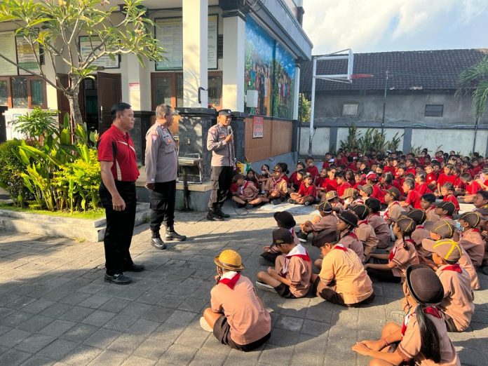Kanit Lantas yang di dampingi Panit 1 Binmas Aiptu I Wayan Sadia dan Bhabinkamtibmas Desa Tibubeneng Bripka I Kadek Ardana menyampaikan penjelasan tentang rambu-rambu lalu lintas dan kenakalan anak ( Bullying ).