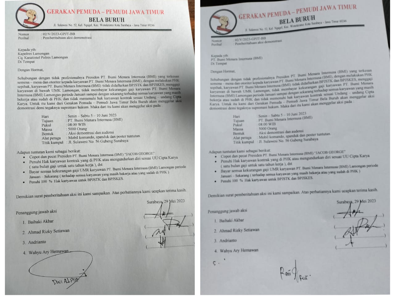 Kami juga sudah mengantarkan surat pemberitahuan aksi demo besar-besaran di PT Bumi Menara Internusa (BMI) ke Polres Lamongan dan PT Bumi Menara Internusa (BMI) dan kami akan menggelar aksi demo besar-besaran tersebut, pada :