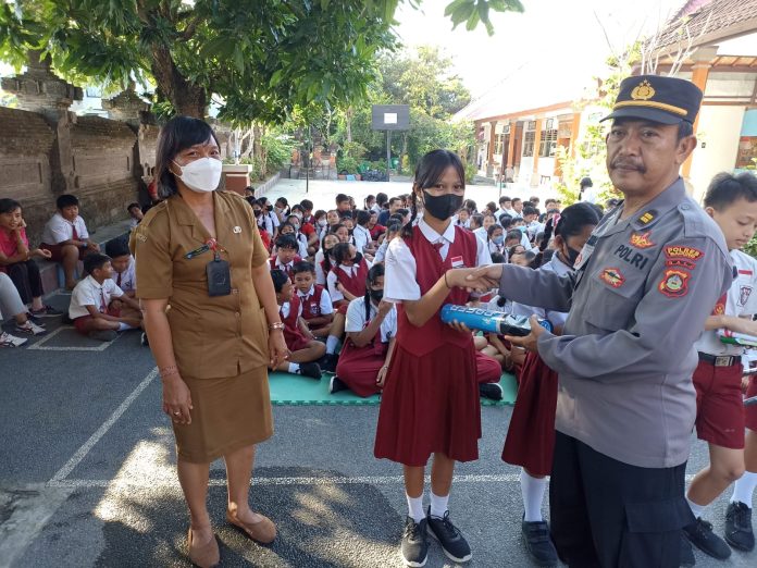 Pagi ini Kanit Binmas Polsek Kuta Utara Iptu AA Ngurah Sudyastika bersama Kanit Lantas Iptu Nyoman Suarjana SH melaksanakan sosialisasi tertib berlalu lintas kepada anak anak Sekolah Dasar no 4 Canggu jalan Batu Bolong, Desa Canggu, Kecamatan Kuta Utara, Kabupaten Badung. Senin (5/6) pagi.