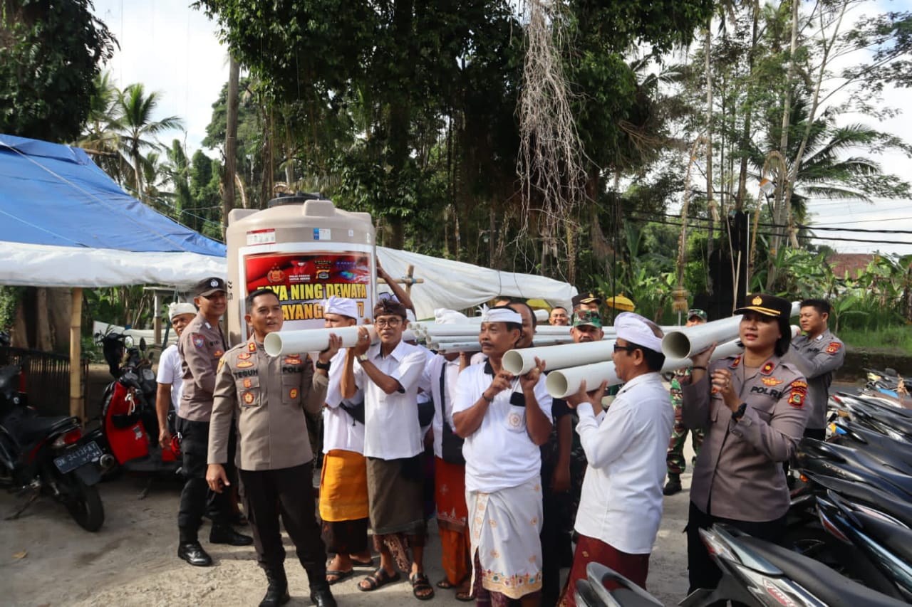 “Kami sebentar lagi akan memperingati hari Bhayangkara ke-77 tahun 2023. Menjelang 1 Juli 2023, Polri mengadakan beberapa kegiatan yang bermanfaat bagi masyarakat. Seperti hari ini kita memberikan bantuan air bersih (Sumur Bor) di Pura Dauh Pasar Binong yang selama ini masyarakat pengempon pura sangat kesulitan mendapatkan air bersih,” Ungkapnya.