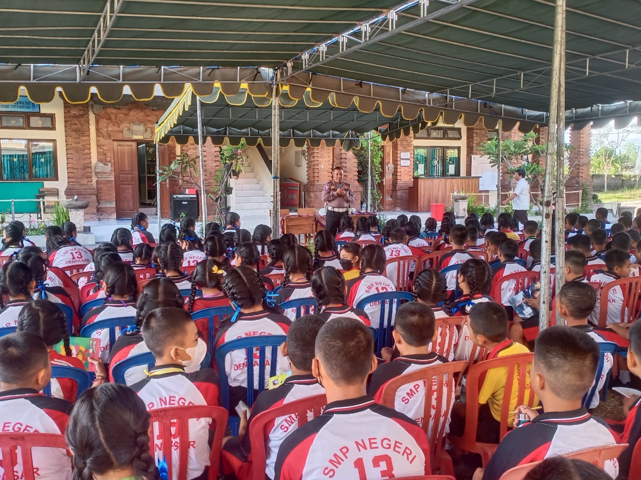 Waka Kesiswaan SMPN 13 Denpasar Bapak I Made Sudiarta, SPd. yang hadir bersama para Guru menyampaikan apresiasi apa yang dilakukan Polresta Denpasar dan berharap dengan kegiatan ini siswa dapat memahami aturan berlalulintas karena sejatinya selama aktivitas belajar mengajar tidak lepas dari lalulintas datang dan pulangnya siswa dari Sekolah.