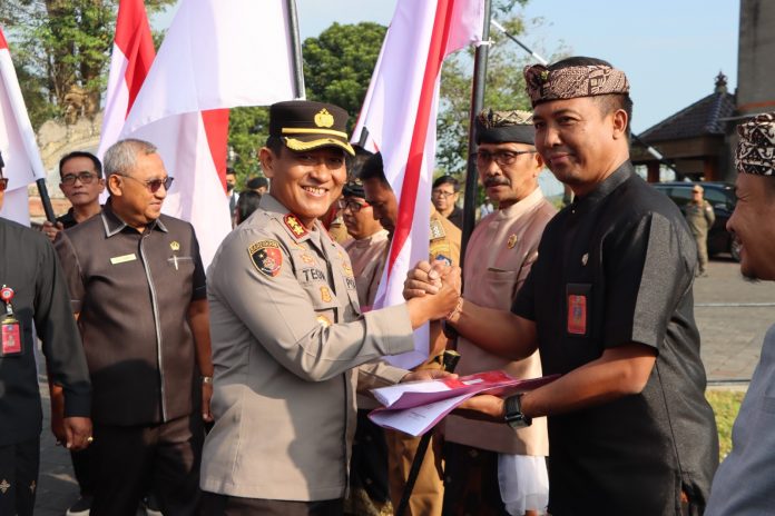 informasi-Realita.net,Bali – Kepala Kepolisian Resor Badung AKBP Teguh Priyo Wasono, S.I.K., menghadiri pembagian 10 Juta Bendera Merah Putih kepada Masing-masing Camat, perwakilan Bendesa Adat dan masyarakat pengendara kendaraan roda dua dan roda empat yang melintas di depan Puspem Badung jalan raya Sempidi Kelurahan Sempidi Kecamatan Mengwi Kabupaten Badung, Bali. Senin (24/07/2023) pagi pukul 08.30 Wita.