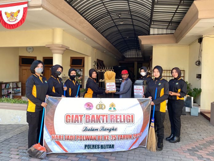 Dalam rangka merayakan Hari Jadi Polwan ke-75, anggota Polwan Polres Blitar menunjukkan komitmen mereka terhadap bakti sosial dengan melaksanakan kegiatan bersih-bersih di tempat ibadah.