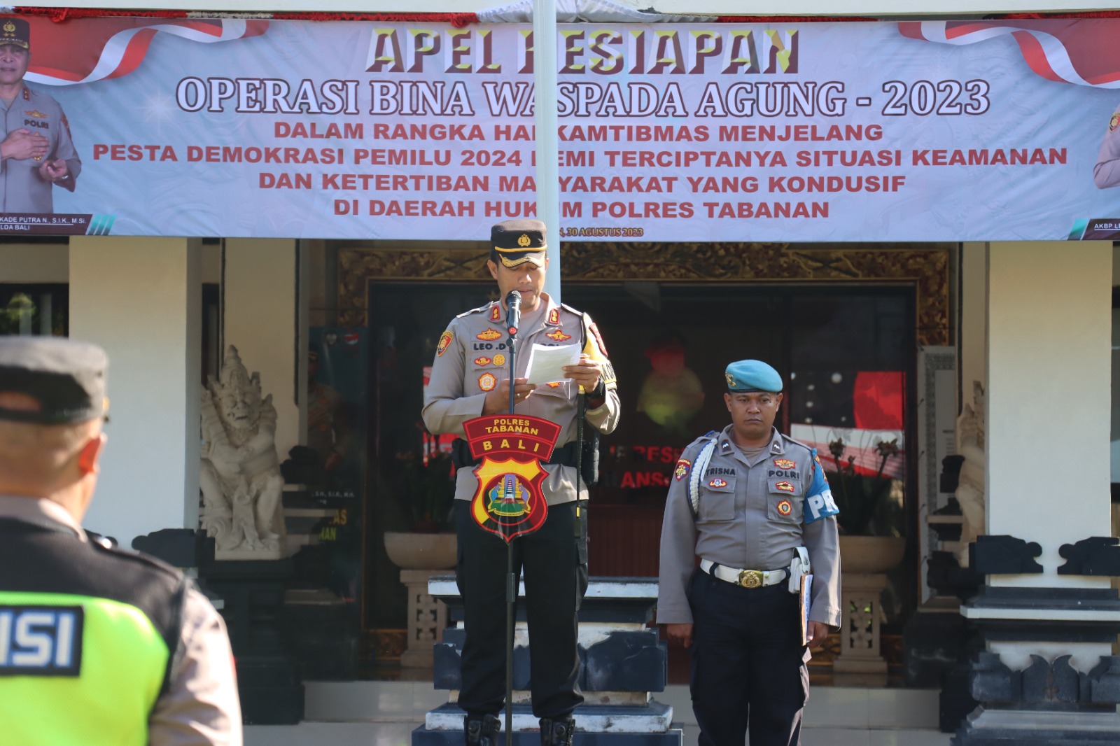 Ditambahkan oleh Kapolres Tabanan, Sebagaimana diketahui bersama bahwa tahun ini merupakan tahun politik di seluruh wilayah indonesia dan akan ada pergerakan dari berbagai partai politik untuk melakukan kegiatan dan memungkinkan adanya gejolak yang bisa menimbulkan situasi kamtibmas kurang kondusif sehingga perlu adanya langkah-langkah preemtif untuk mencegah gangguan kamtibmas agar tidak berkembang dengan menggelar operasi “Bina Waspada Agung-2023”. Yang mengedepankan fungsi preemtif.