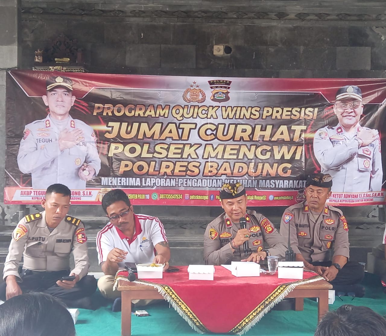 Informasi-Realita.net,Bali – Kepala Kepolisian Sektor Mengwi Kompol I Ketut Adnyana T.J S.Sos.,S.H.,M.M., melaksanakan kegiatan Jumat Curhat dikantor Desa Buduk yang berlokasi di lingkungan Banjar Tengah, Desa Buduk, Kecamatan Mengwi, Kabupaten Badung, Bali. Jumat (1/9/2023) pukul 09.15 wita