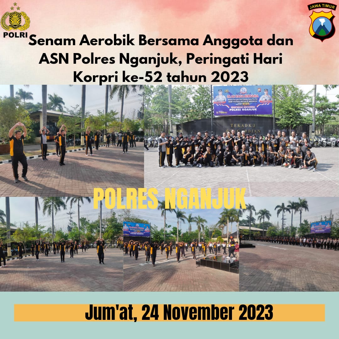INFORMASI-REALITA.NET || NGANJUK – Dalam rangka memperingati hari Korp Pegawai Republik Indonesia (Korpri) ke – 52 tahun 2023, seluruh anggota bersama ASN (Aparatur Sipil Negara)Polres Nganjuk melaksanakan senam aerobik di halaman apel Polres Nganjuk, Jumat (24/11/2023).