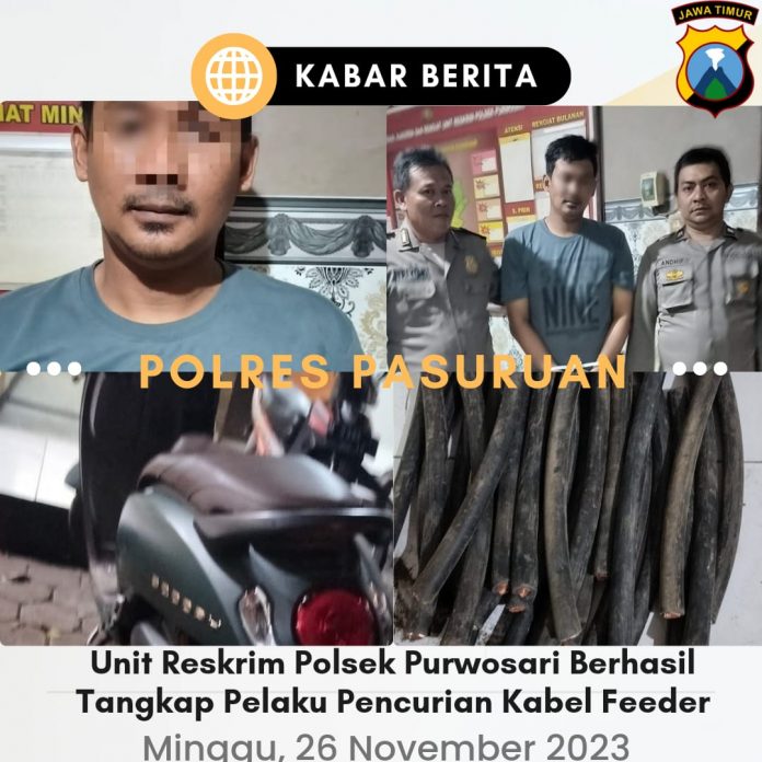 INFORMASI-REALITA.NET || PASURUAN – Unit Reskrim Polsek Purwosari Polres Pasuruan yang dipimpin oleh Kasat Reskrim Polres Pasuruan AKP Achmad Doni Meidianto, S.T.K., S.I.K., M.H. yang didampingi Kapolsek Purwosari AKP. Hudi Supriyanto, SH, berhasil mengamankan pelaku pencuri kabel Feeder di wilayah Kecamatan Purwosari, Minggu (26/11/2023).
