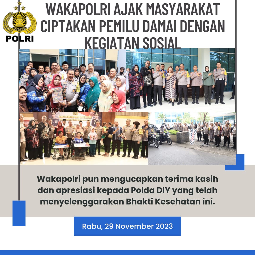 Bhakti Kesehatan dan Bhakti Sosial ini diselenggarakan menjelang Pemilu 2024 guna merangkul masyarakat untuk sama-sama mewujudkan pesta demokrasi aman dan damai. Polda DIY menyediakan beberapa pelayanan pemeriksaan kesehatan gratis dan bakti sosial.
