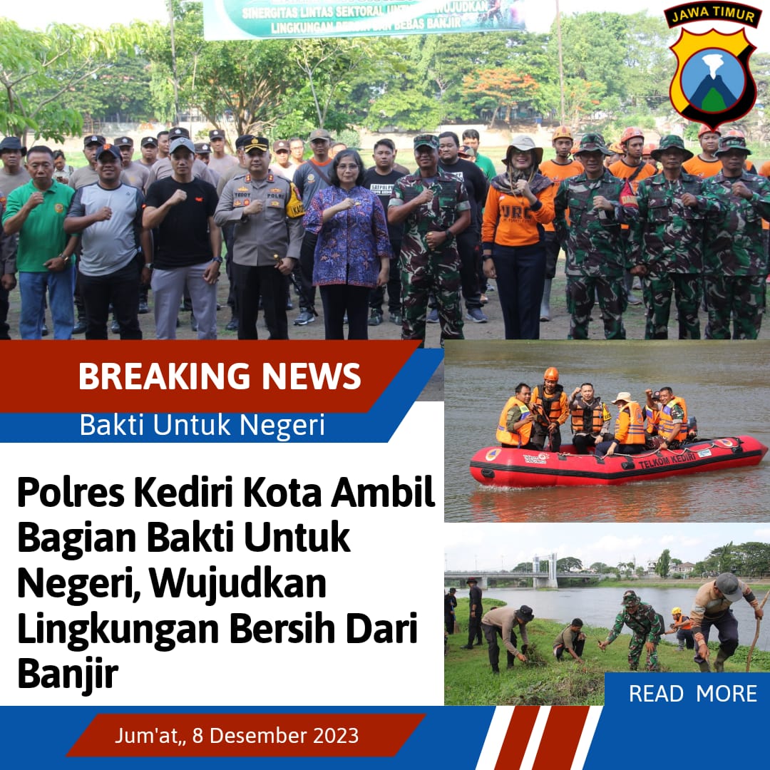 INFORMASI-REALITA.NET || KEDIRI KOTA — Polres Kediri Kota bersama TNI, Pemkot Kediri beserta Masyarakat menggelar aksi bersih-bersih Bantaran Sungai Brantas Kota Kediri yang bertajuk “Bakti Untuk Negeri, Wujudkan Lingkungan Bersih Dari Banjir di Kota Kediri” Jum’at (08/12/2023).