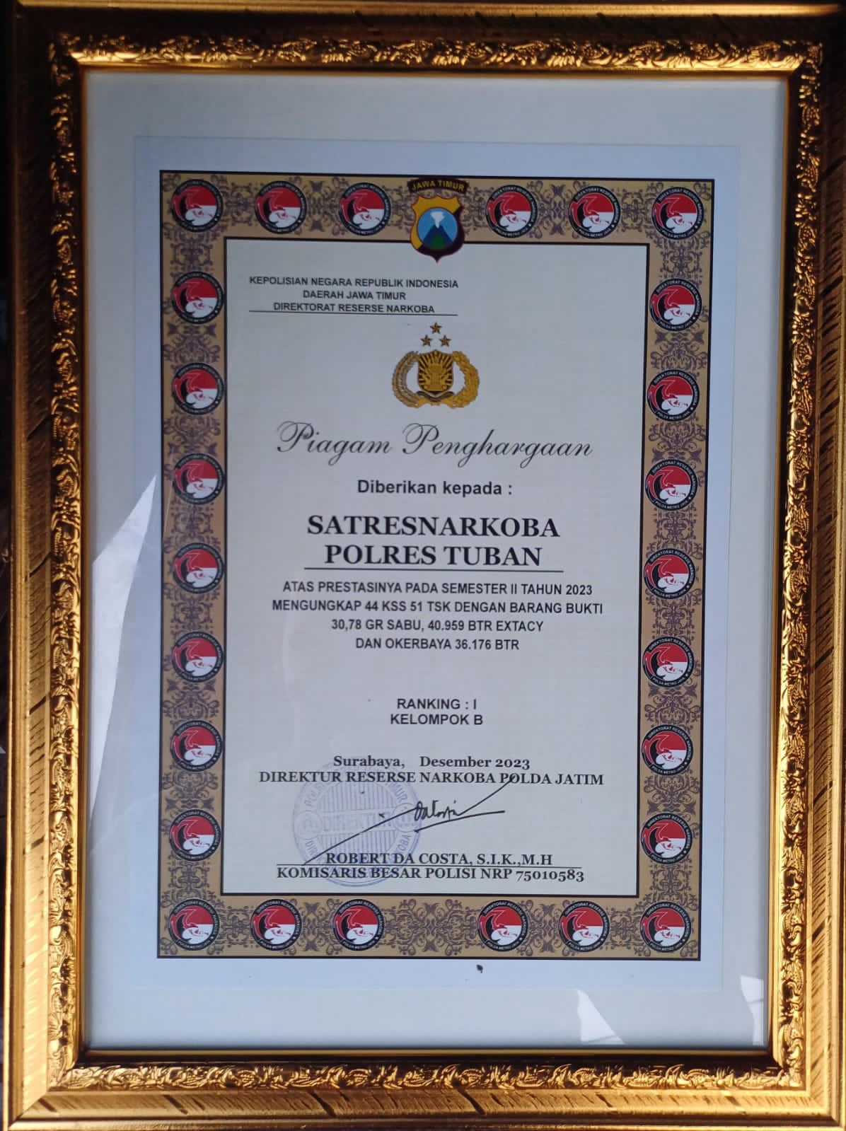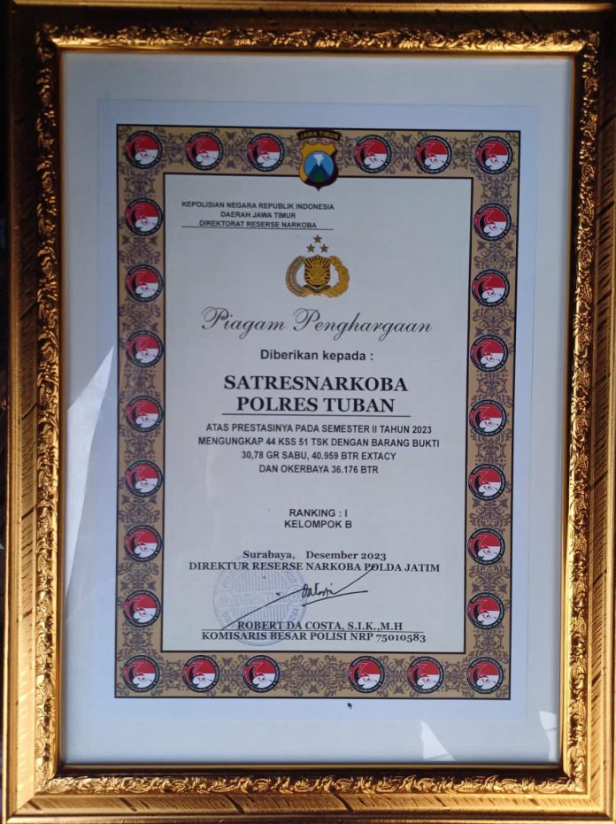 Penyerahan piagam penghargaan tersebut diberikan langsung oleh Dir Narkoba Polda Jatim Kombes Pol Robert Da Costa kepada Kasat Narkoba Polres Tuban AKP Teguh Priyo Handoko.