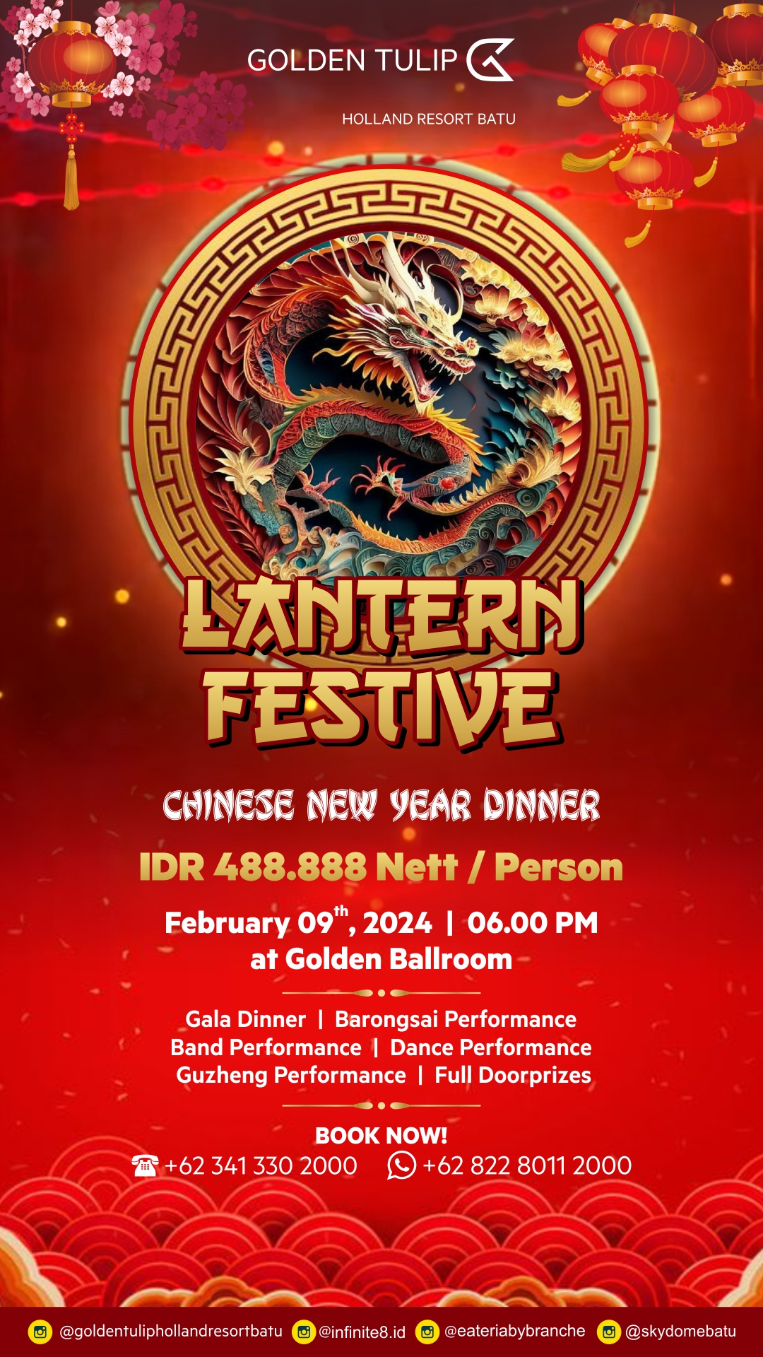 Rangkaian acara untuk menyambut Tahun Baru Imlek 2024 dikemas sedemikian rupa yang dimulai dari dekorasi Imlek dengan lampion khas Cina, dekorasi Naga, pohon angpou termasuk dengan pertunjukan Barongsai yang juga akan melakukan atraksi di semua restaurant dan setiap sudut Hotel termasuk Gala Dinner yang akan di gelar di Golden Ballroom – Golden Tulip Holland Resort Batu.