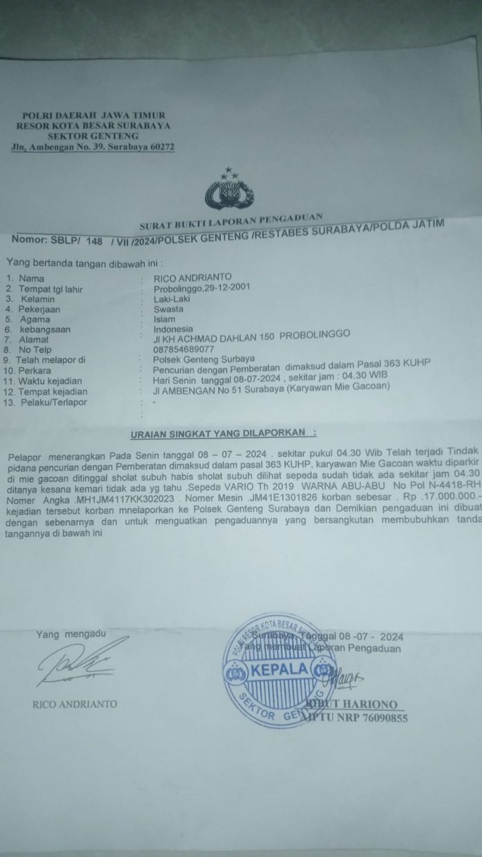 “Kronologi kejadian waktu itu saya hendak pulang ke rumah setelah bekerja di Mie Gacoan Surabaya. Karena mendekati waktu subuh, saya juga sempat menunaikan shalat subuh. Setelah selesai shalat, saya kaget melihat sepeda motor sudah tidak ada lagi di tempat parkirannya,” ucap R.A.